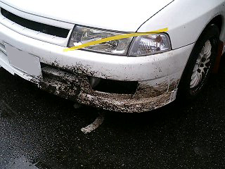 牽引フックカバー脱落、スプラッシュシールド外れ、フォグライト変形、アンダーカバーは・・・見当たらないが元々ないんだっけ?