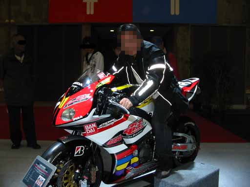 仮面ライ○ー電王 8耐車に跨るおっさん。